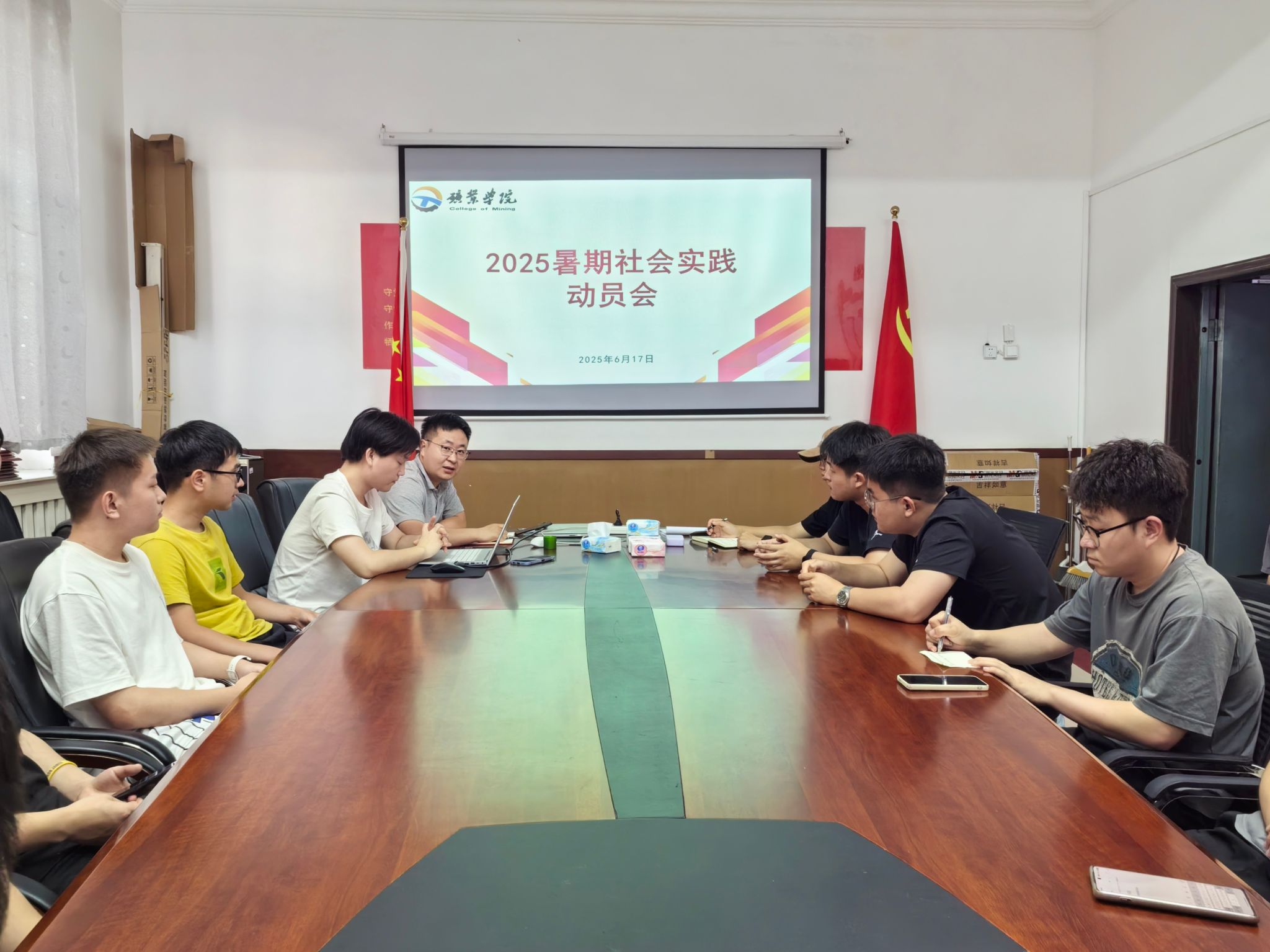 团委于致远楼208组织召开暑期社会实践动员会。蒋来老师召集大一至大三团支书参会旨在凝聚学生骨干力量,为暑期实践筑牢组织保障。