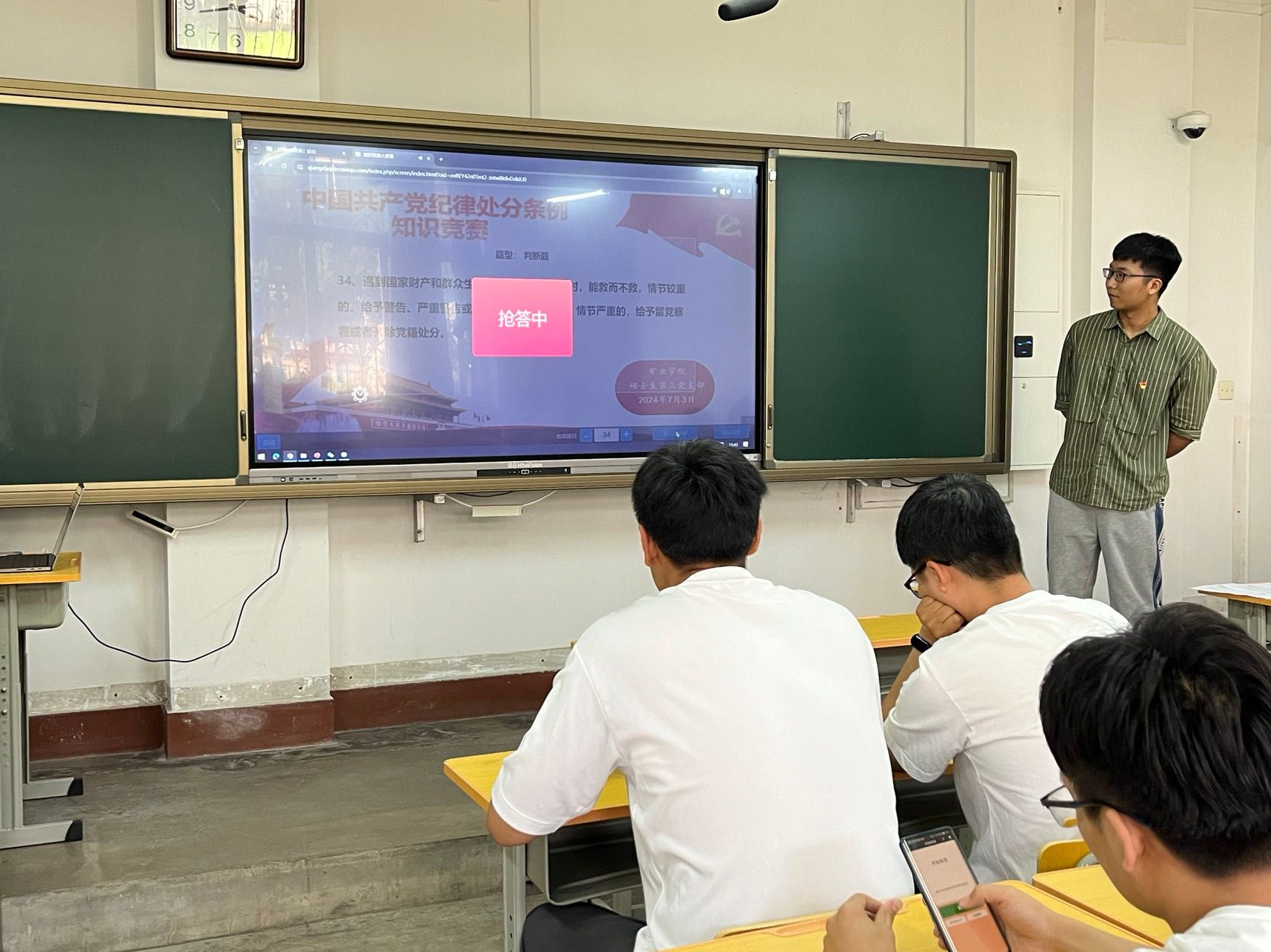 硕士生第三党支部于新华楼103室开展了“党纪党规刻我心”知识竞赛主题党日活动。本次活动由支部书记张玉龙同志主持,支部全体党员及入党积极分子代表参加本次活动。