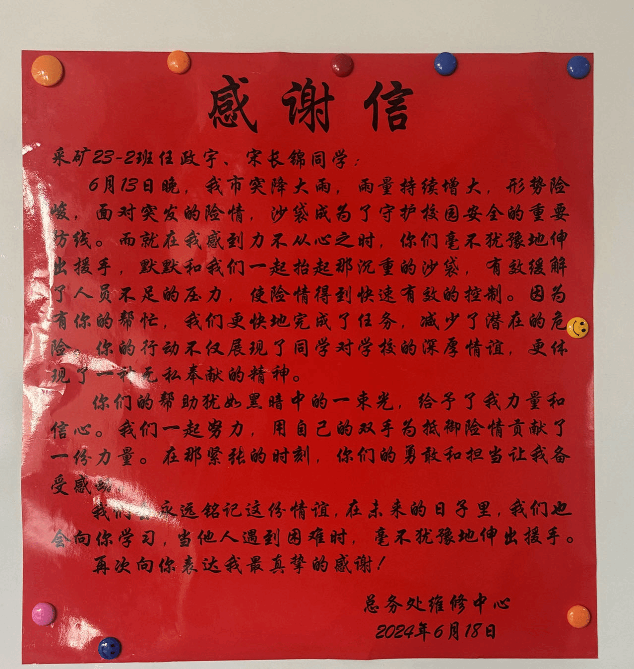 6月13日晚,我市突降大雨,雨量持续增大,校园防洪形势严峻,我院采矿23-2班任政宇、宋长锦两位同学不顾天气恶劣,冒着暴雨帮助总务处搬运防洪沙袋,倾尽全力为校园安全筑起防线。总务处为两位同学送来感谢信,学院也对两位同学提出表扬,两位大一同学在险情面前表现出的是矿业学子的责任和担当,希望全体同学向任政宇、宋长锦两位同学学习。