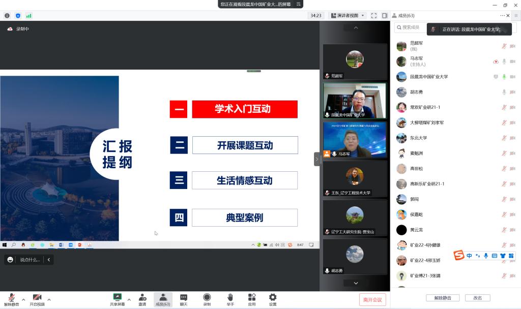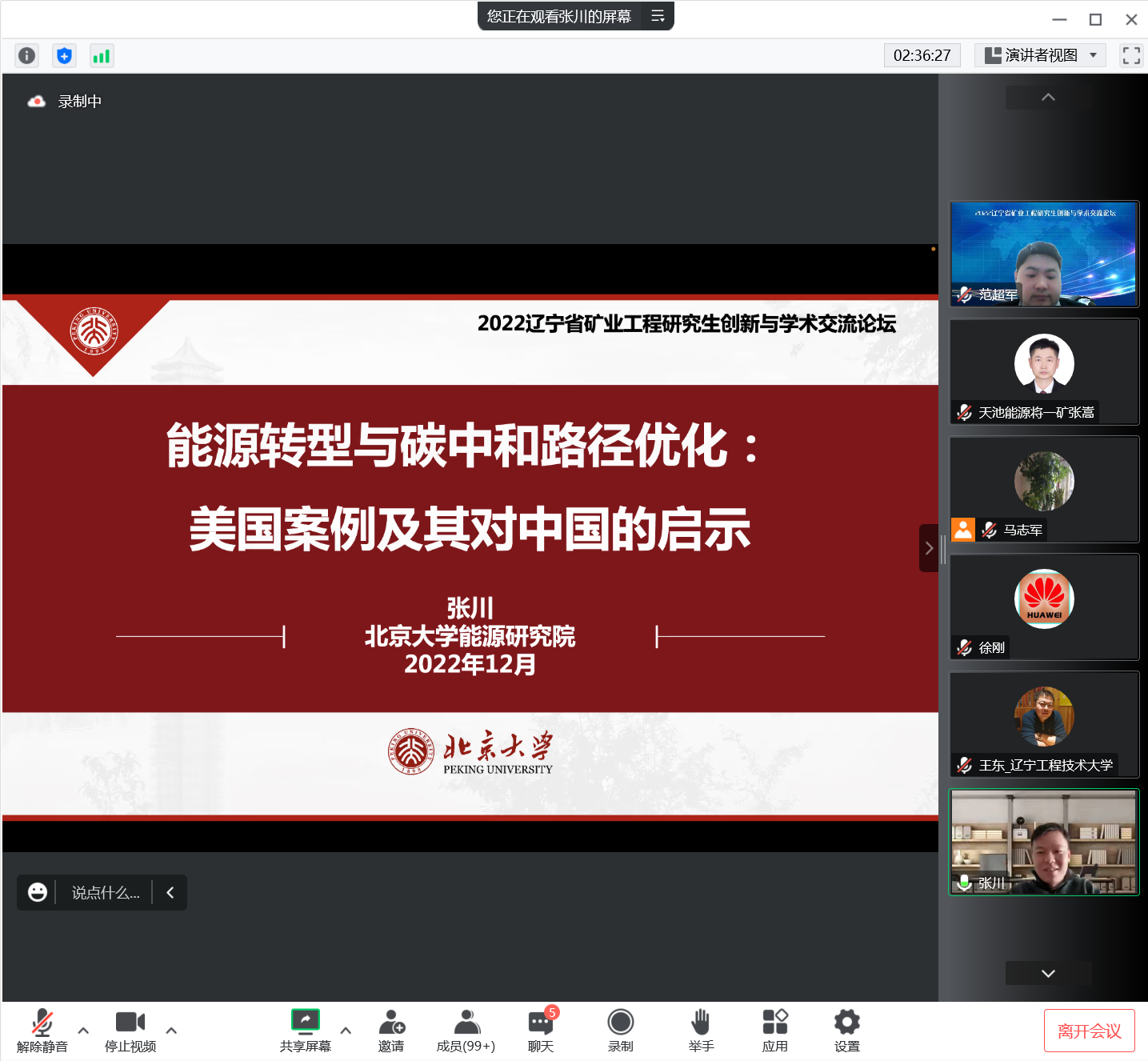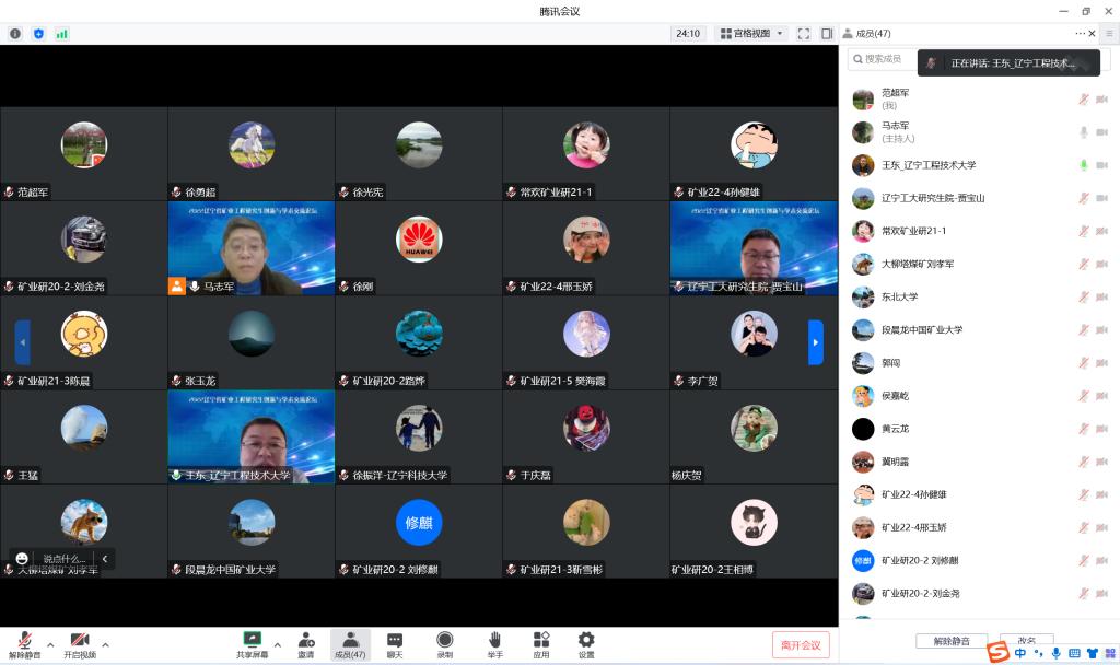 如期举行。本次论坛得到了各矿山企业、高等院校、科研院所等单位的大力支持,为广大专家学者及研究生提供了广阔的交流平台。会议采取线上方式,来自中国矿业大学研究生院、东北大学资源与土木工程学院、北京大学能源研究院、辽宁科技大学矿业工程学院、煤矿机器人协同创新中心等省内外诸多高校专家学者和研究生以及中煤科工开采研究院有限公司、国家能源集团神东煤炭集团公司等企业界代表共200余人参加大会。