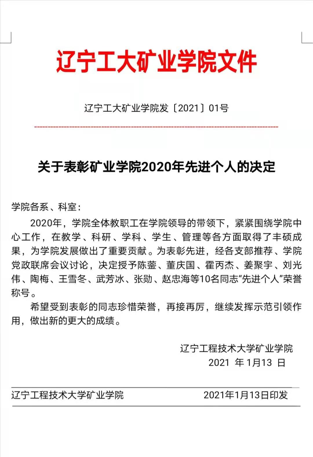 2020年度先进个人的决定》,陈蓥、董庆国、霍丙杰、姜聚宇、刘光伟、陶梅、王雪冬、武芳冰、张勋、赵忠海等10名教师被评为小宝影院