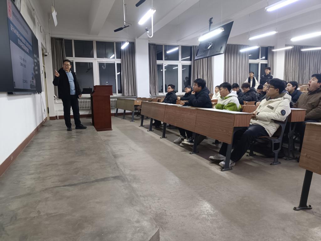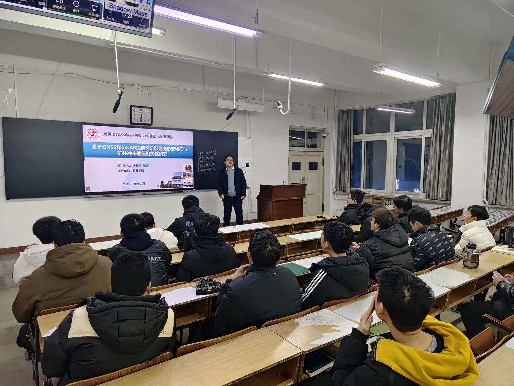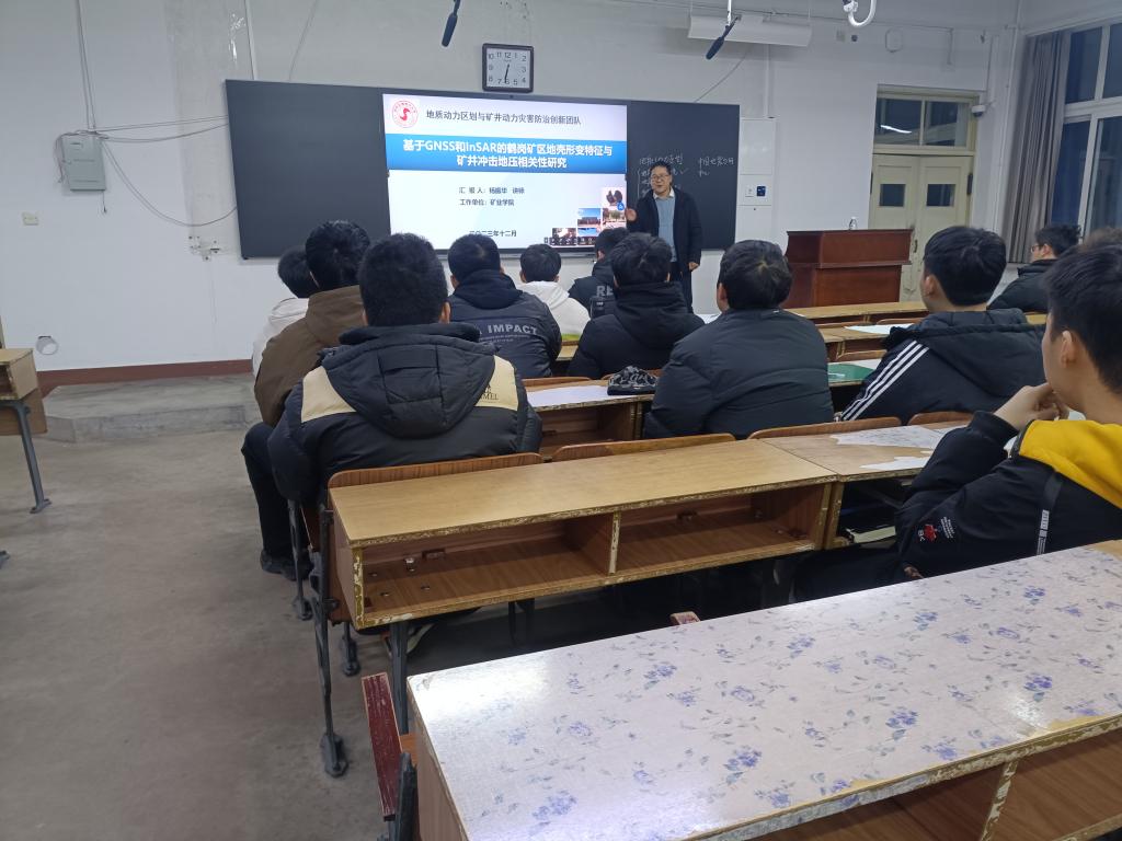 杨振华老师在新华楼302开展—“基于GNSS和InSAR的鹤岗矿区地壳形变特征与矿井冲击地压相关性研究”的报告,采矿工程专业全体同学积极参与。